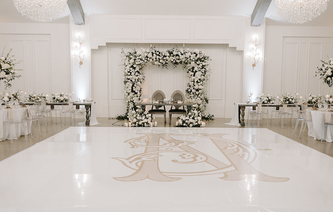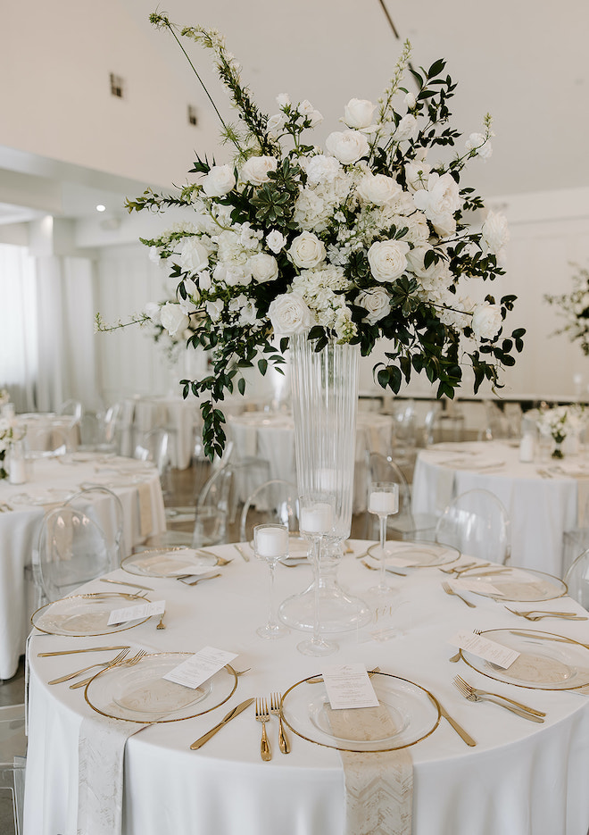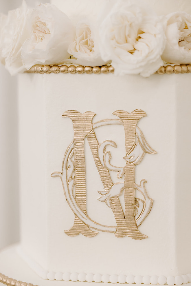The newlyweds celebrated their nuptials with a glamorous champagne, white and gold reception to commemorate their marriage. Cakes by Gina designed a stunning 5-tier white wedding cake for the couple’s big day. The elaborate cake was a work of art adorned with white roses and gold accents, perfectly tying in the reception decor. After an evening of joyous celebration, the couple exited under a shower of rose petals and sparklers.