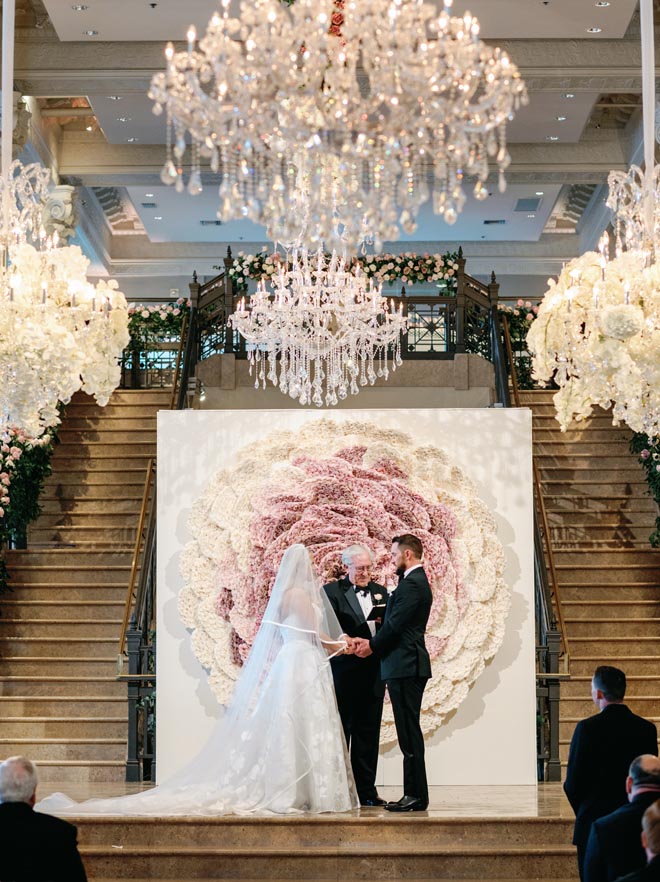 On March 4, 2023, Kristin and Logan pledged their love at the historic Corinthian Houston. Neutral hues dominated this elegant affair. Their wedding ceremony featured blooming florals adorning the grand staircase and a breathtaking floral installation as a backdrop for the couple’s nuptials.