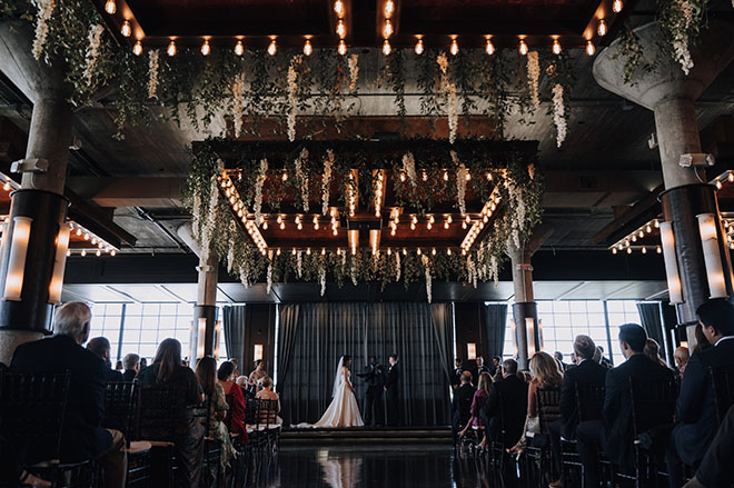 Anna and Ryan wed on July 22, 2023, at The Astorian, an industrial-chic wedding venue overlooking the Downtown Houston skyline. The ceremony featured a sophisticated palette of champagne and black hues, accented by lush hanging greenery that brought a romantic touch to the space. Mandi Roach Photography captured the couple’s emotional vows. “We were just so stinking excited to be getting married,” Anna says. “We wanted all that joy to be captured.”