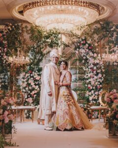 The couple exchanged vows during a romantic fall church ceremony. The aisle was adorned with fragrant pastel blooms, creating an elegant setting as family and friends celebrated the newlyweds. Adding a touch of vintage charm, Amira and Jeries made a grand entrance to their reception in a vintage, white Rolls Royce from Houston Classic Wedding Cars.