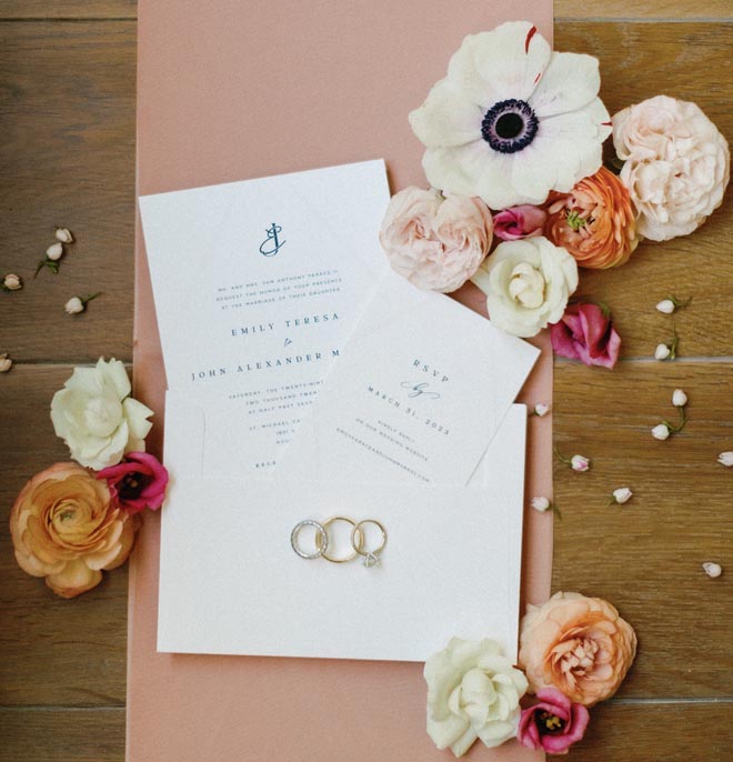 On April 29, 2023, Emily and John made it official with a traditional church wedding and ballroom reception at the Omni Houston Hotel. The hotel dazzled with twinkling lights, colorful blooms and greenery, embracing a springtime garden theme. Brit Floyd Weddings expertly captured photos of the couple dancing under canopy lights. The couple cut into a four-tier cake by Cakes by Gina, embellished with flowers, before dancing the night away with their loved ones. As Emily fondly recalled, “Getting all our favorite people in one room to celebrate our marriage with us” was the best part of their special day.