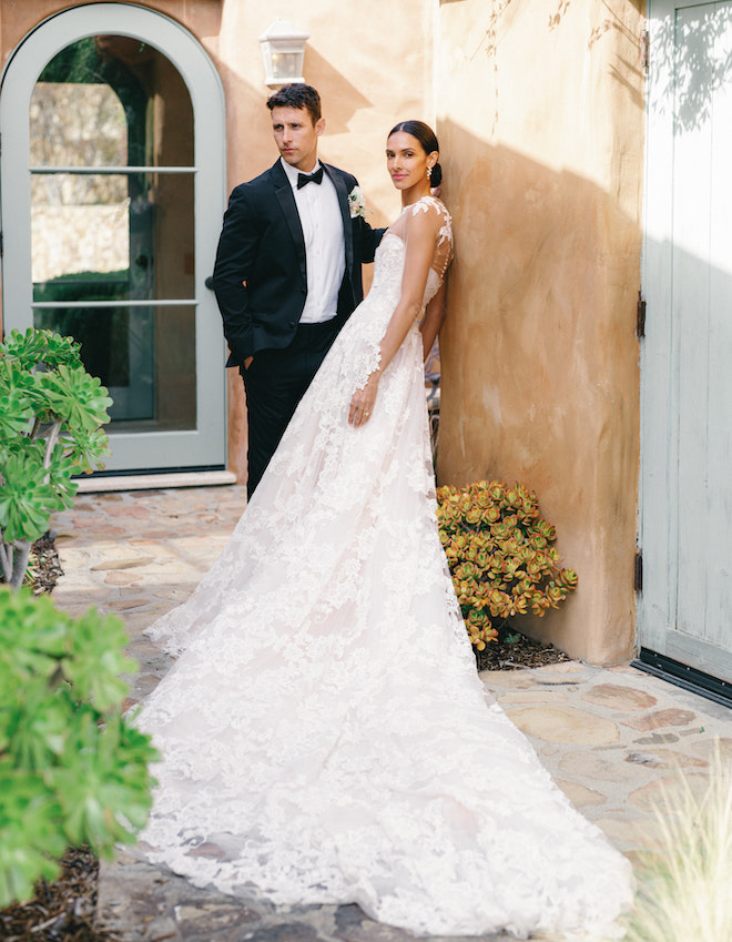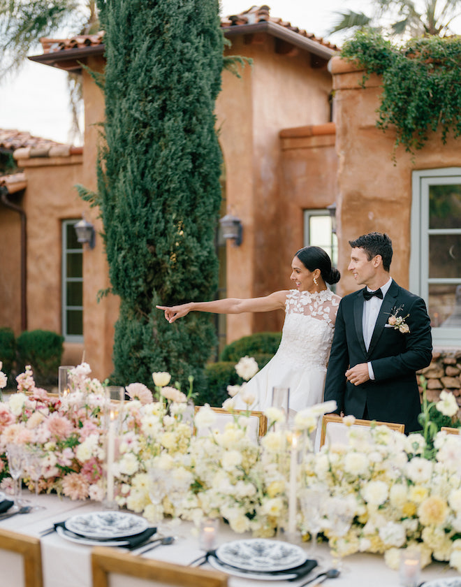 Captured amidst the breathtaking valley of Ojai, California, this editorial is a pictorial journey through the essence of a desert wedding. The bride radiates elegance in her whimsical off-the-shoulder ceremony gown by Monique Lhuillier and transitions to an elegant, chic reception gown by Sareh Nouri, both harmonizing beautifully with Ojai’s tranquil mountain scenery. The tablescape, a work of art in itself, boasts a unique ombre floral design, with colors that complement the venue and echo the serene beauty of the surroundings. This editorial is a treasure trove of ideas for those seeking desert wedding inspiration that combines chic elegance with a peaceful ambiance.