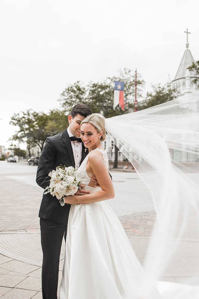 After a year of wedding planning, high school sweethearts Emily and Tyler were just two weeks away from officially tying the knot, but then the COVID-19 pandemic hit. “It happened so quickly,” says Emily. “We had less than two weeks to decide what we wanted to do. Everything that we had been planning for a year came to a stop. However, it made us realize that we truly just wanted to be married to one another and we could always celebrate with everyone another time.” On March 28th, 2020, Emily and Tyler exchanged vows in a traditional catholic ceremony amidst their family members. The bride looked gorgeous in a classic sleeveless wedding gown and elegant bridal up-do by Janelle Alexis Salon. Following a white rose petal sendoff, the newlyweds strolled around the empty streets of downtown Houston for romantic wedding day portraits.