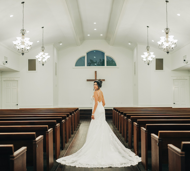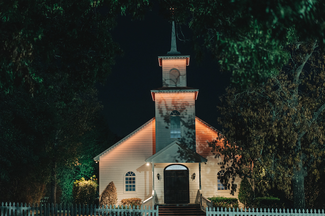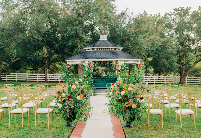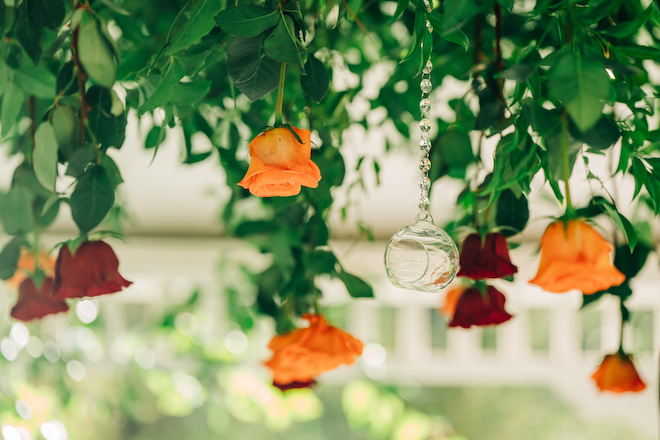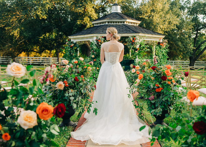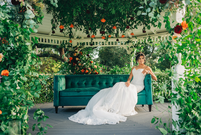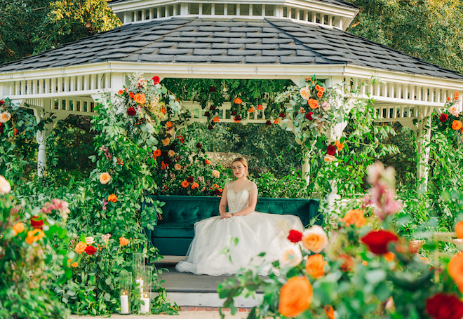 This bloom-filled fantasy highlights the venue’s charming event spaces, from the pristine white vintage chapel to the quaint garden gazebo. Autumn hues inspired the color palette for this fall wedding editorial with enchanting florals that detailed the garden gazebo. Red and orange blooms provided pops of color alongside pastel pink roses and lush greenery. To complement the rich fall color scheme, emerald green and gold accents enhanced the floral’s autumnal beauty for the alfresco affair. Tying everything together, For Heaven’s Cake designed a decadent three-tier white wedding cake embellished with red roses.
