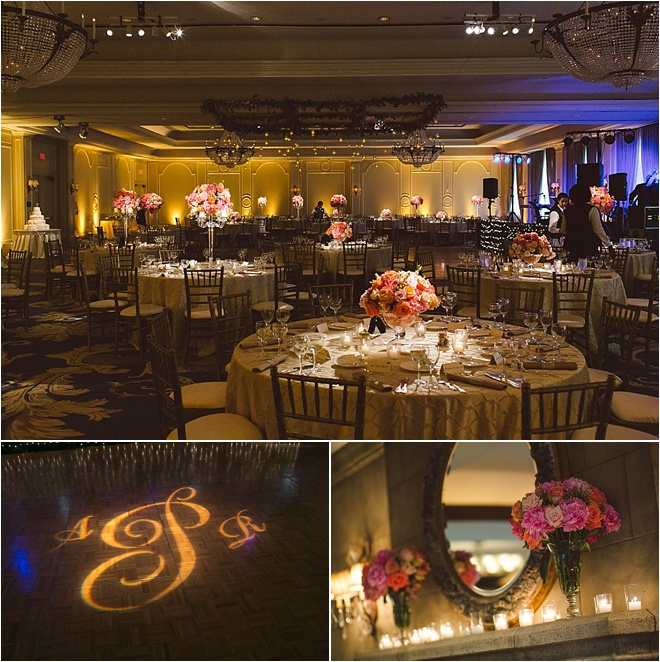 Ashley had been bugging Rick to plan the perfect date night, and that he did. Rick made dinner reservations at one of their favorite restaurants. Even when were then seated at a table with a dozen roses and a bottle of wine, Ashley still didn’t suspect anything. After all, they were low-key, private people–it never occurred to her that Rick would propose in public. But as soon as they were done with their meal, the restaurant’s manager personally presented the couple with dessert under a cloche cover. When Ashley removed the cloche, she discovered a ring box, and, well, let’s just say it turned out to be a date night she’d never forget. Ashley and Rick’s opulent wedding at The Houstonian Hotel, Club & Spa was a dream come true. “We ended up creating exactly what we wanted, a very festive and romantic atmosphere with a classic feel that recognized the importance of the moment”,” the bride says. Tall pink and peach candelabras, and hanging candles above the dance floor, added the perfect touch of romance and elegance to the evening. Thanks J. Cogliandro for the beautiful photos, and congrats to the newlyweds!