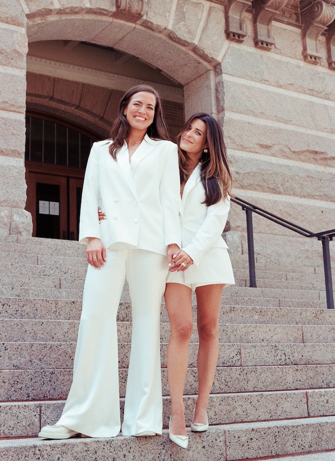 The stylish brides kept things effortlessly cool, with Caroline in a sleek white suit set and Toni rocking a crisp white blazer and shorts. Both carried calla lilies — a simple yet meaningful detail that added a romantic touch to the moment.
