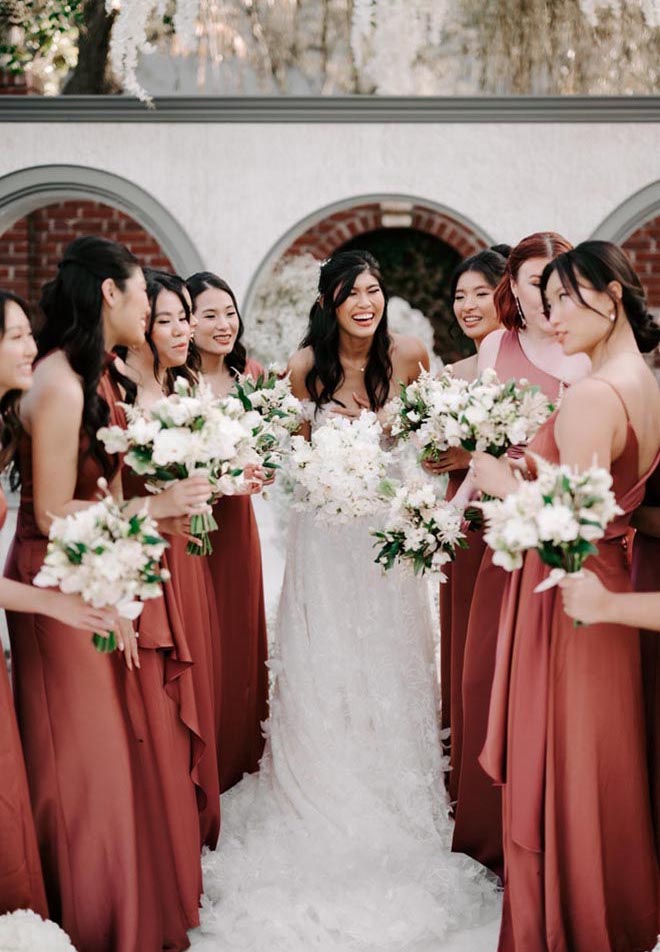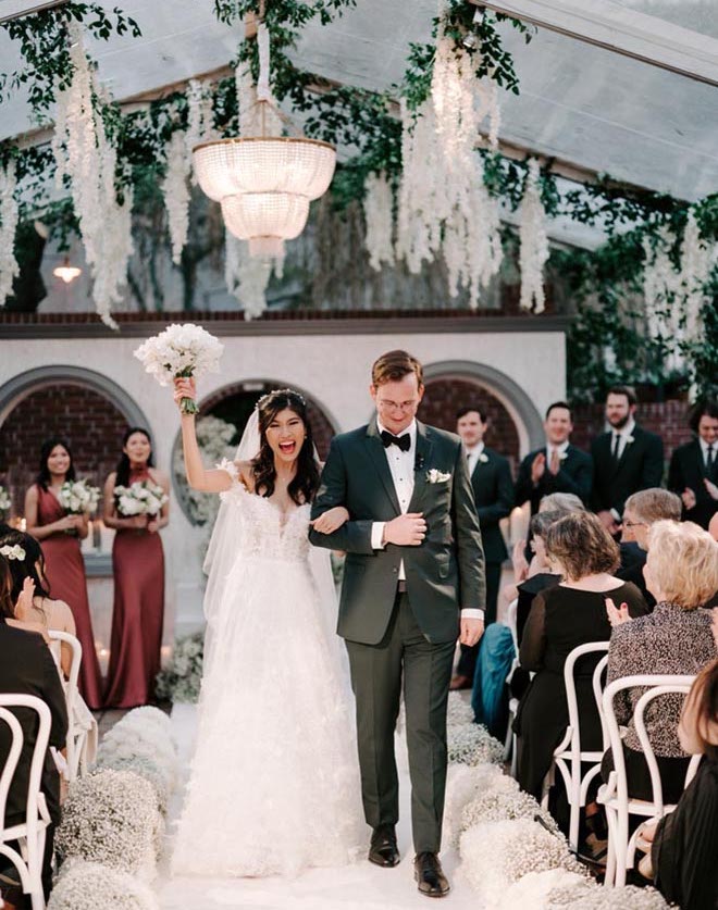 On December 30, 2022, the couple pledged their love amid an enchanted forest brought to life with lush greenery, white florals and earth-toned hues. Mindy glided down the aisle in a romantic Pronovias gown to meet her groom.