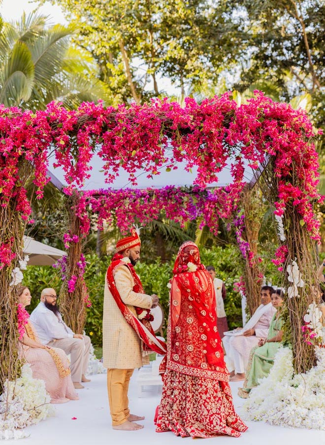 Continue scrolling to see the ocean vistas and colorful shades that created the perfect setting for the couple’s tropical Indian-fusion wedding.