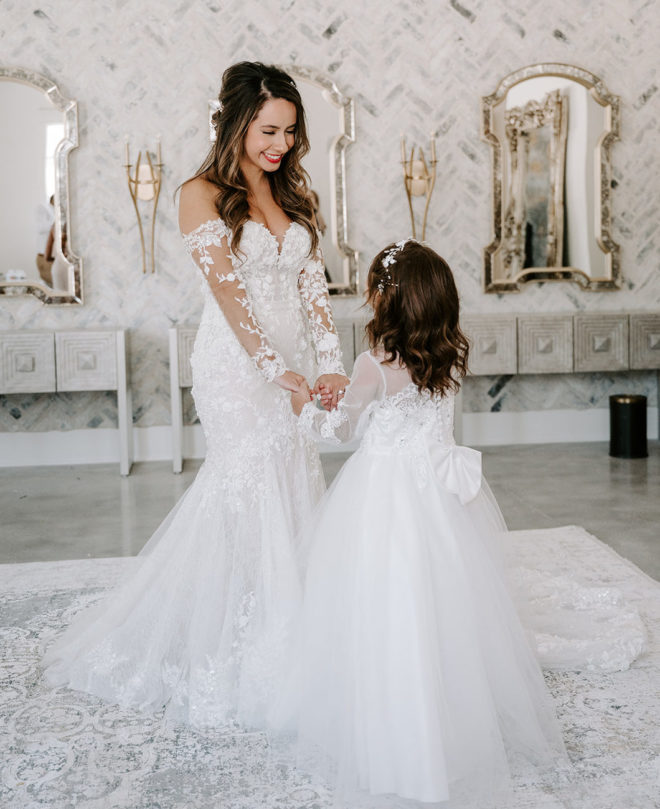 On September 25, 2021, the couple married at The Peach Orchard, a stunning venue on a historic property in The Woodlands, where 400 peach trees once grew. Lush greenery trailed along the aisle as Lesly made her way to her groom at the altar, where both of their dogs wearing green garlands sat.